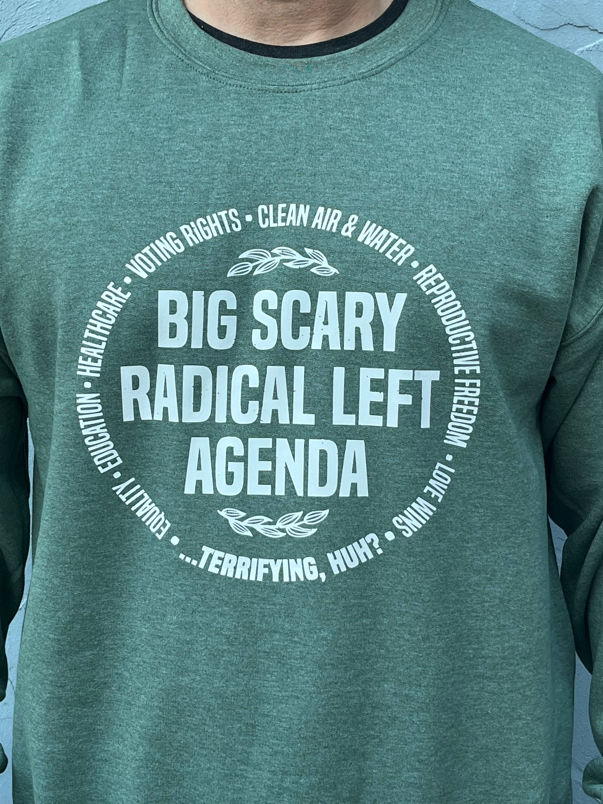 Our big, scary, radical left agenda sweatshirt calls out the so-called "radical left agenda" for what it really is: voting rights, clean air, reproductive freedom, equality, education, healthcare, and basic human dignity.